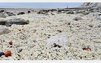 감자튀김으로 뒤덮인 英 해변…“화물선 실수에 생태계 파괴 우려”