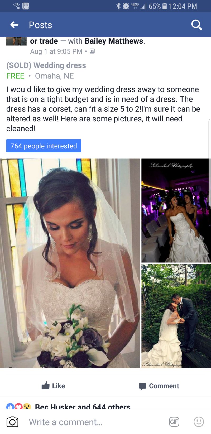 하지만 하인즈 씨는 페이스 북 매매 그룹에 웨딩드레스 사진을 올렸습니다. 그는 “웨딩드레스를 살 여유가 없는 신부에게 드리겠다”고 제안했습니다.