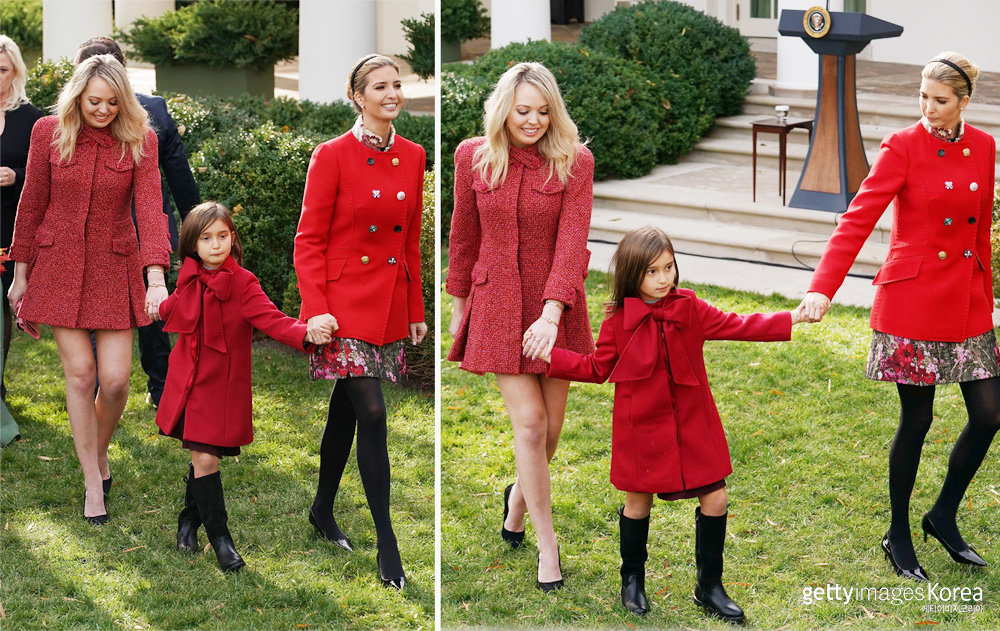 쌀쌀한 날씨에도 티파니는 짧은 진홍색 트위드 코트를 입고 긴 맨다리를 시원하게 드러냈습니다. 안에 입은 짧은 드레스는 코트에 가려 보이지 않았습니다. 언니 이반카 역시 붉은 돌체앤가바나 피코트를 맞춰 입었지만, 안에 검은색 스타킹을 신었습니다.