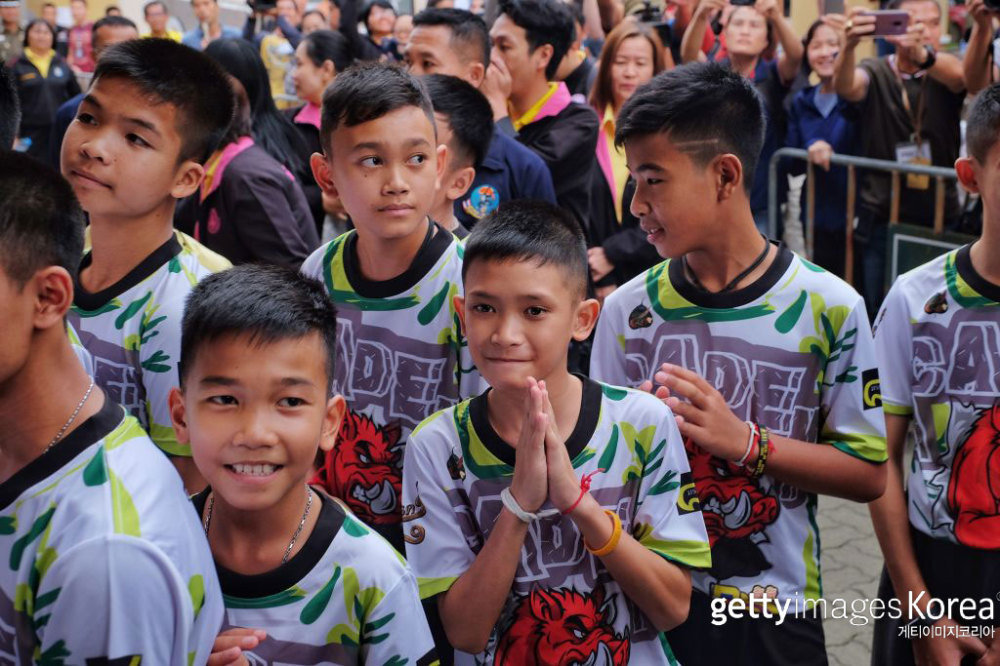 태국 치앙라이주 탐루엉 동굴에 갇혀있다가 18일 만에 생환한 12명의 유소년 축구선수들과 코치가 구조 후 처음으로 공식 석상에 모습을 드러냈다.