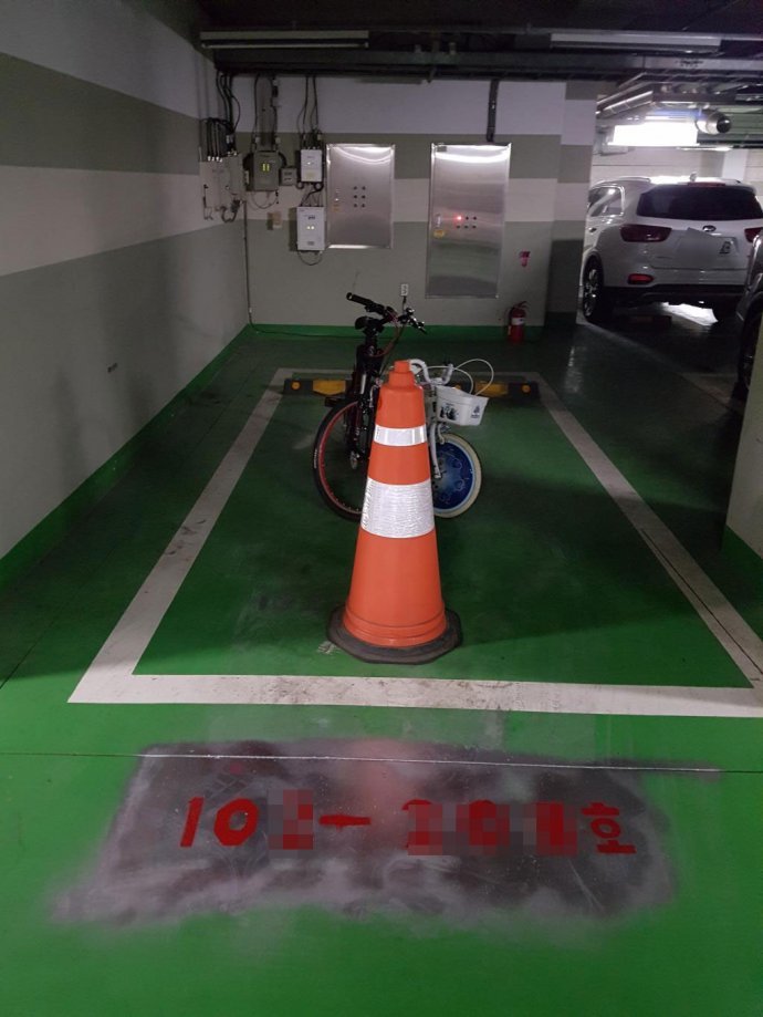 실제로 공개된 사진에는 차량이 주차될 자리에 자전거 한 대와 '주차 금지'를 뜻하는 삼각콘이 놓여 있다. 주차 자리 밖으로는 자신이 사는 동·호수를 크게 적어놨다.