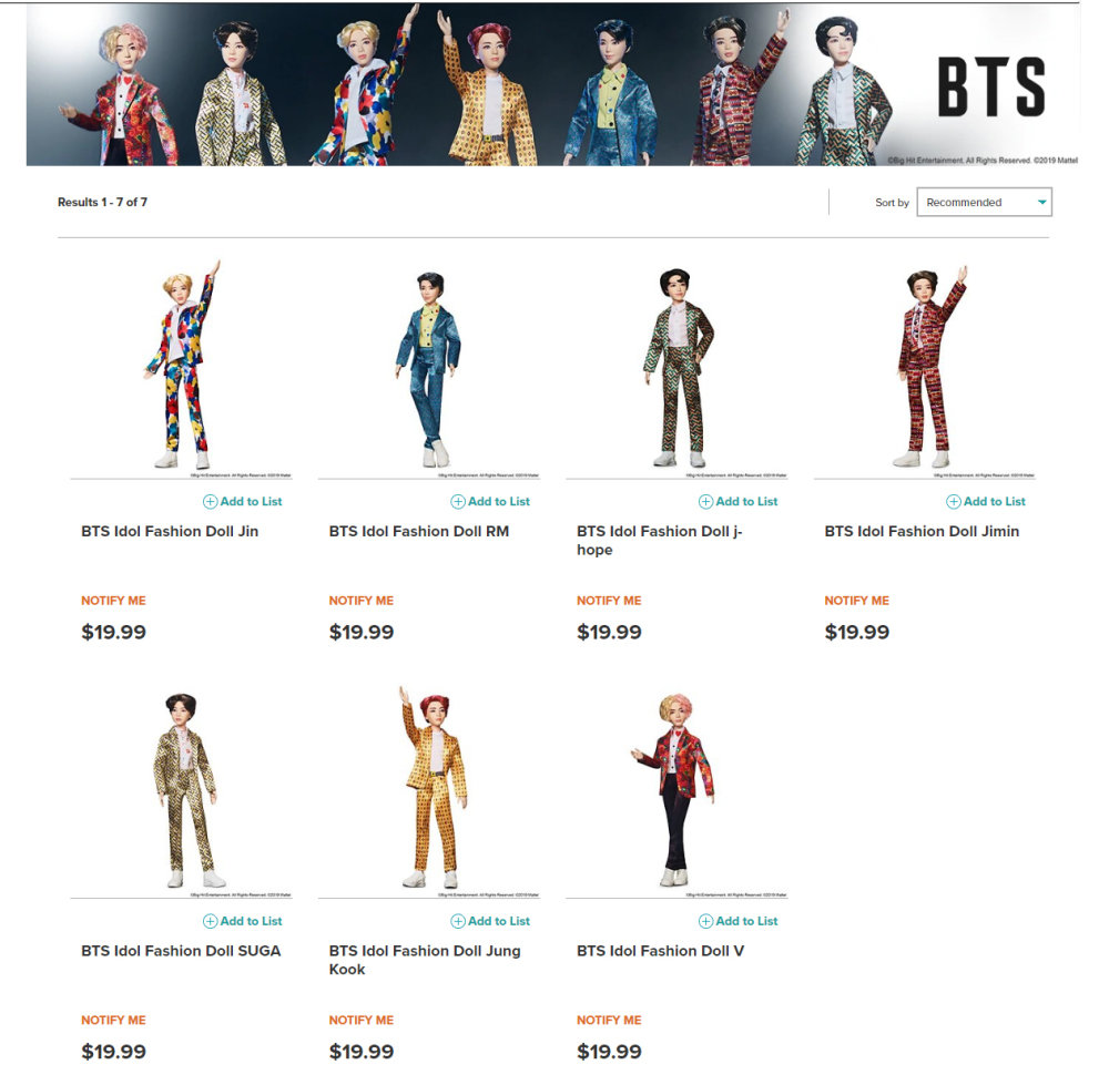 마텔은 3월 26일 공식 트위터(@Mattel) 계정을 통해 “처음으로 #BTSxMattel 패션 인형의 라인을 보여 드리게 되어 기쁘다. 아이돌 뮤직 비디오에서 영감을 받은 인형으로 뷔, 슈가, 진, 정국, RM, 지민 및 제이홉을 보시라”라는 글과 함께 인형 사진을 공유했다.