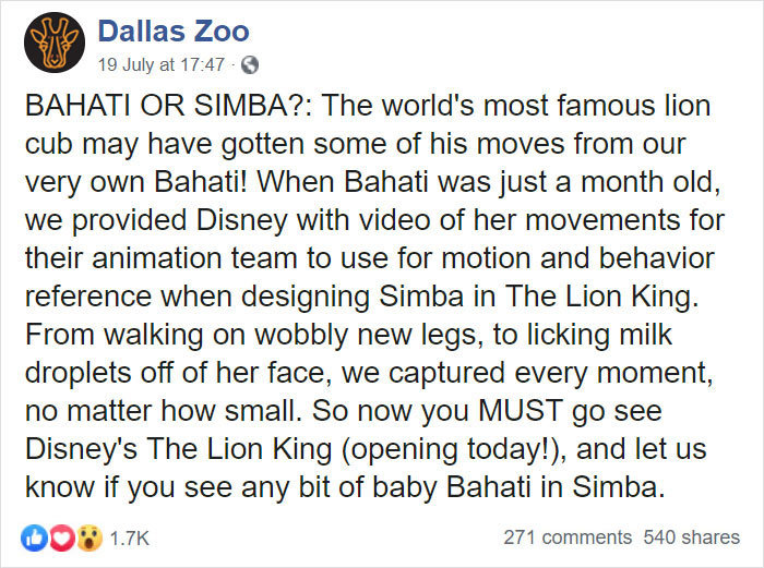 보어드판다에 따르면, 동물원은 바하티의 모든 것을 찍어 디즈니에 보냈다고 합니다. 뒤뚱뒤뚱 걷는 것부터, 우유를 마시다 코에 묻은 것까지, 작은 것부터 큰 것까지 전부 말입니다. 디즈니는 이를 가지고 심바의 움직임을 에니메이션으로 구현해 냈습니다.