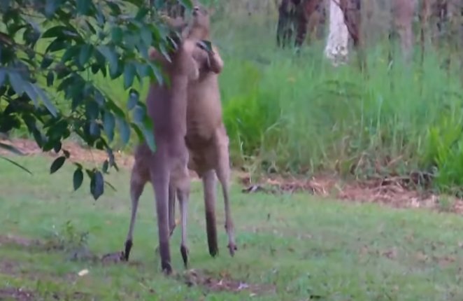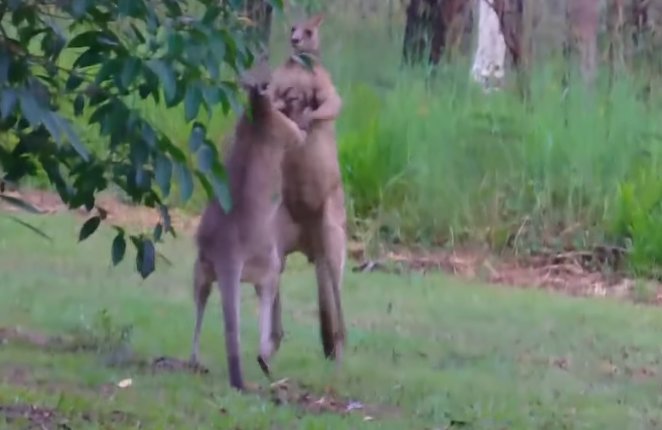 호주에서 촬영된 것으로 알려진 캥거루 영상은 두 다리와 꼬리로 사람처럼 일어선 모습으로 앞발로 서로를 공격하며 발로 상대방을 차면서 격렬하게 싸웁니다.