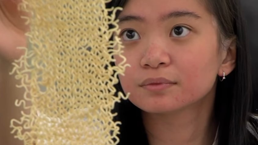 보도에 따르면 라면을 뜨개질 실로 이용하기 위해서는 기초 작업이 필요합니다. 라면을 끓인 후에 찬물에 불리면 잘 끊어지지 않는 라면 실이 완성됩니다.