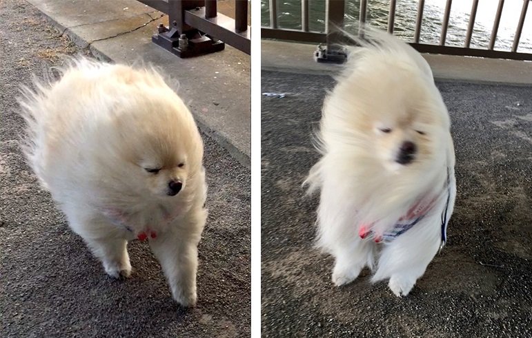주인과 함께 산책을 나간 모코(포메라니안·4살)는 역풍을 맞고 말았습니다. 평소 풍성한 털을 자랑하는 모코는 매섭게 부는 바람에 눈도 제대로 뜨지 못했습니다.