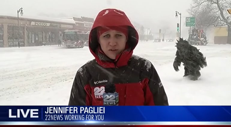 설인은 현지시간으로 지난 9일 미국 22 뉴스에서 기상예보관이 미국 일리노이주 스피링필드의 폭설 소식을 전하는 도중 나타났습니다.