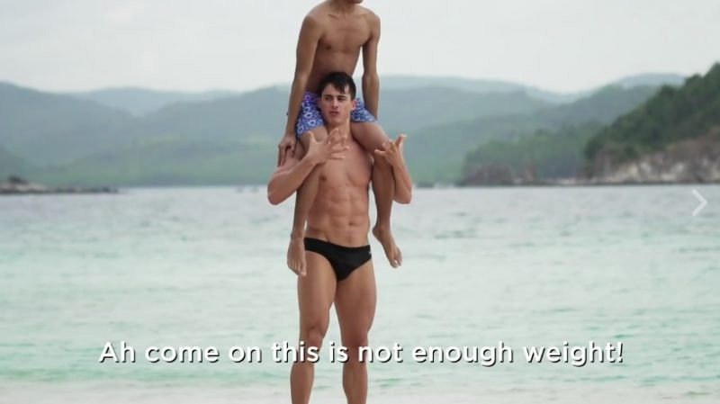보셀리는 두 팔로 남성을 들어올리거나 어깨에 앉히고 스쿼트 운동을 하는 등 다양한 근력 운동을 선보이며 몸매를 과시했습니다. 남성은 기회가 있을 때마다 도망가려고 하지만 매번 잡혀 인간 역기 역할을 해야 했습니다. 보셀리는 어깨에 앉은 남자가 너무 가볍다면서 여유를 보였고 필리핀 남성이 큼직한 열매를 두 손에 들자 “이제 딱 좋네”라고 만족스러워 했습니다.