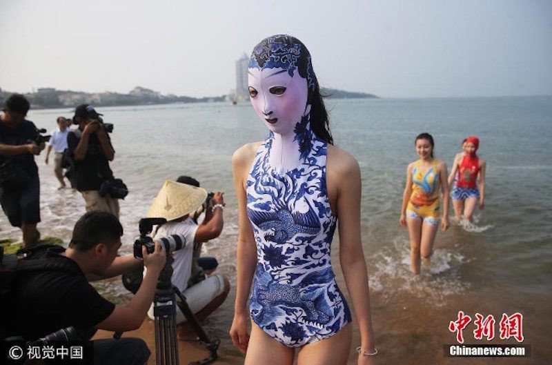 중국 전통 도자기 문양이 그려진 원피스형 수영복. 고전적인 아름다움이 느껴지는데요. 몸 부분만 보면 여느 수영복과 다를 게 없지만 독특하게도 머리 전체, 목까지 수영복 천으로 덮여 있습니다.