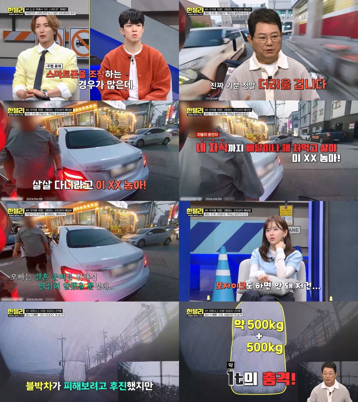 이날 한문철 변호사가 "진짜 기분 더러울 겁니다"라며 공개한 영상 속에는 골목길을 주행하던 오토바이가 전방에서 오는 외제차를 피하며 서행하는 모습이 담겨있었다. 하지만 외제차 운전자가 차에서 내려 오토바이 운전자에게 격앙된 목소리로 "살살 다녀 XX 놈아"라며 다짜고짜 욕설을 뱉는 모습이 포착됐다. 오토바이 배달원은 대화로 풀려 했으나 외제차 운전자는 배달업을 업신여기며 모욕적인 말을 서슴지 않게 내뱉었다. "거지 XX, 거지라서 배달한다", "네 자식까지 배달 일 시켜라"라고 말하는 외제차 운전자의 역대급 폭언에 패널들은 경악을 금치 못했다. 이에 이특은 "인격이 보인다"라며 분노했고, 이수근 또한 "저런 사람들은 뿌리를 뽑아야 해"라고 했다.