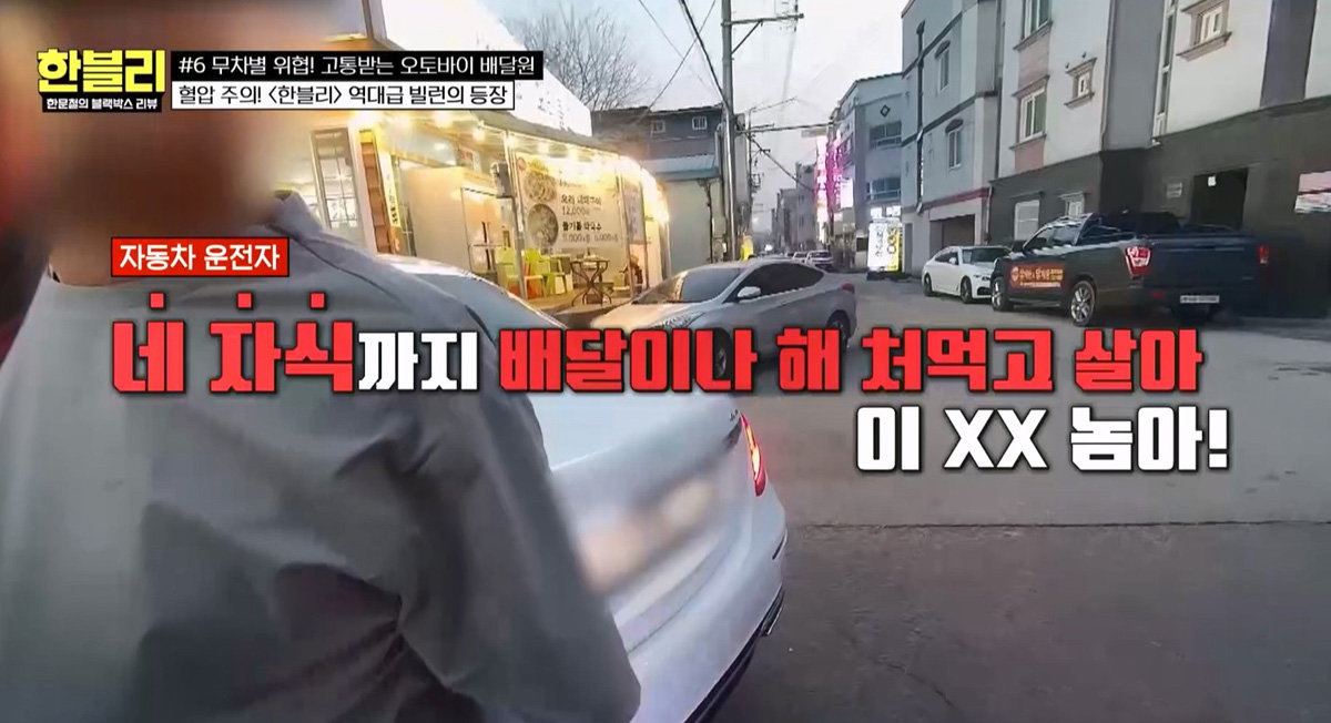 JTBC \'한문철의 블랙박스 리뷰\'가 골목길에서 마주친 외제차주에게 무차별 폭언을 당한 오토바이 배달원의 사연을 조명했다.