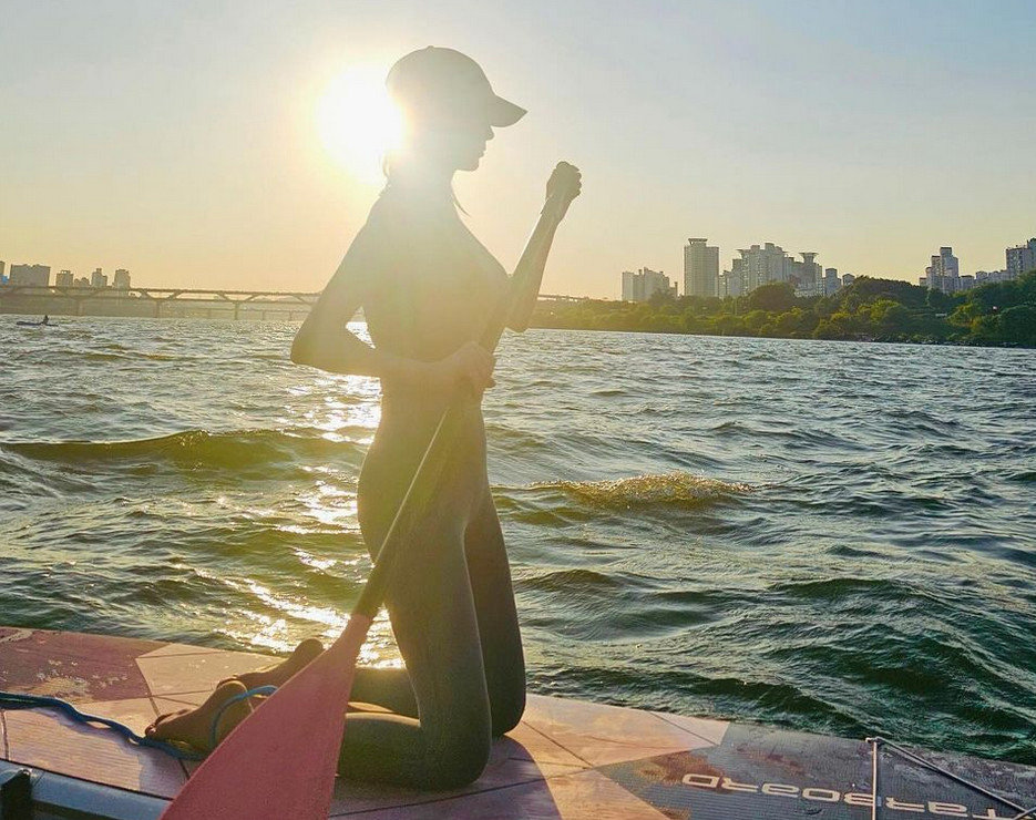 서현은 한강에서 서핑을 즐기고 있다. 활동성과 스타일리시함을 모두 잡은 레깅스 패션으로 눈길을 끈다. 서현의 깡마른 몸매 라인이 더욱 돋보인다.