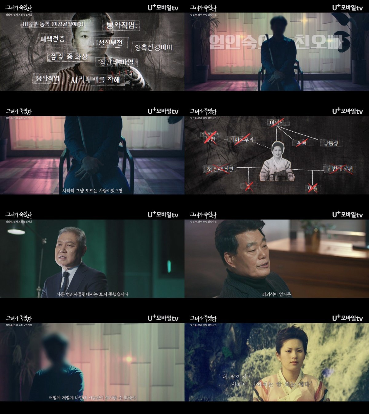 보험설계사 출신인 엄인숙은 보험금을 타 내기 위해 남편과 형제, 심지어 어머니까지 범행 타깃으로 삼았다. 그리고 이들을 사망에 이르게 하거나 실명하도록 하는 잔혹한 범죄를 저질렀다. 사건 당시 엄인숙의 신상은 공개되지 않았지만, 앞서 ‘그녀가 죽였다’ 예고편을 통해 엄인숙의 얼굴이 19년 만에 처음으로 공개됐다. 당시 엄인숙의 면담 프로파일러였던 권일용은 “지금까지와 다른 형태의 연쇄 살인이었기에 굉장히 충격적이었다”라고 돌아봤다.