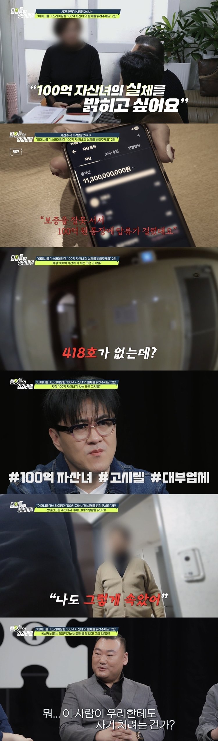 이후 백호 탐정단은 의뢰인의 어머니가 살고 있는 집에 1억 9천만 원의 근저당을 설정한 인물, ‘사채업자 B씨’를 찾아간다. 앞서 의뢰인은 “100억 자산녀가 사채업자 B씨에게 갚아야 할 돈에 대해 어머니가 대신 집을 담보로 잡아줬다”고 전한 바 있다. 그런데 B씨는 “나는 사채업자가 아니다. 똑같이 속은 피해자”라며 예상치 못한 이야기로 모두를 경악하게 만든다. 곧이어 B씨와 100억 자산녀의 관계, 그리고 그가 어떻게 의뢰인 어머니의 집을 담보로 잡게 됐는지 전말이 밝혀진다. 이에 데프콘은 “너무 악질이다”라며 격분하고, 남성태 변호사 역시 “이런 경우는 저도 처음”이라며 혀를 내두른다.