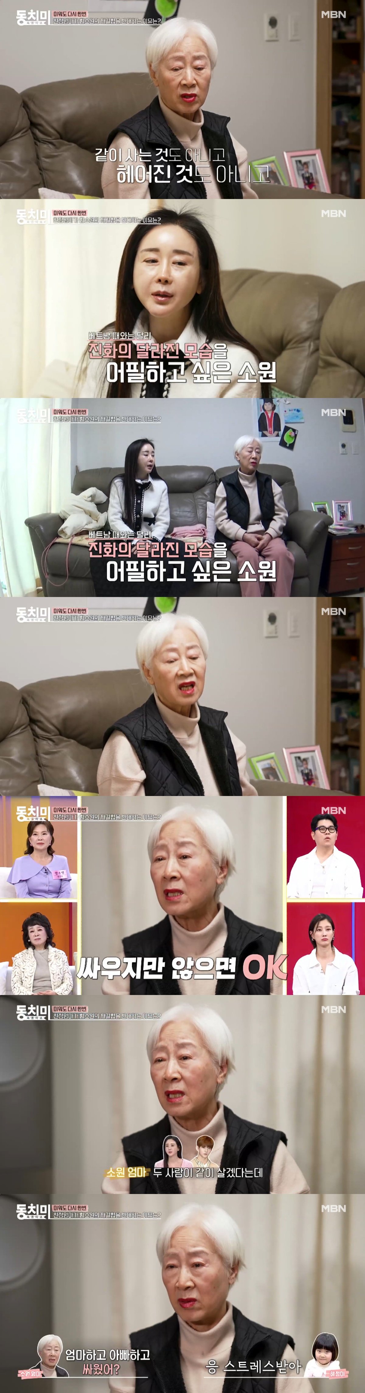 또 “두 사람이 산다는데, 오케이 좋다”라고 말하면서도 “안 싸우는 날이 없는 것 같다. (손녀) 표정이 이상해서 물어보면 ‘스트레스 받는다’라고 하더라”라고 함소원, 진화의 재결합을 반대하는 이유에 대해 말했다.