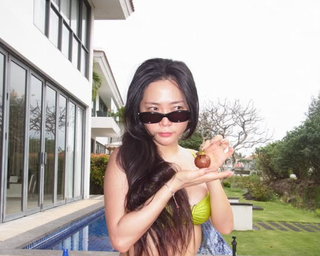 공개된 사진 속 허니제이는 푸른 자연을 배경으로 연두색 비키니를 입고 다양한 포즈를 취하며 여유로운 시간을 보내고 있다.