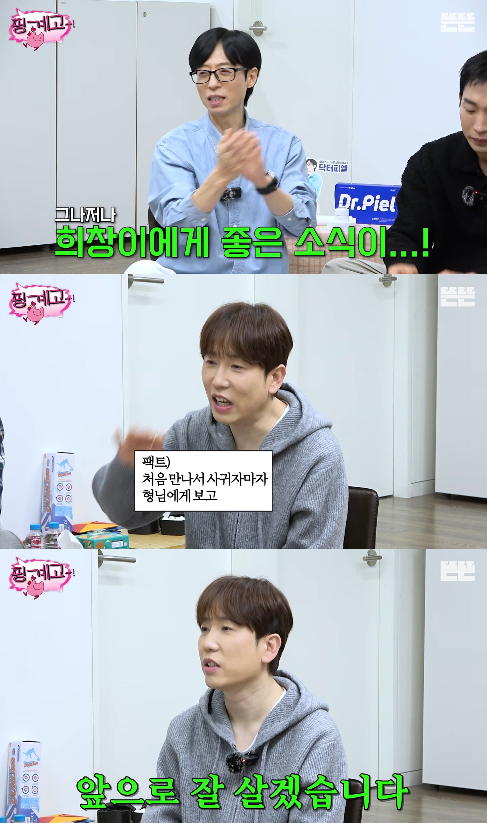 유재석은 “창희에게 좋은 소식이 있다. 2월 22일 드디어 창희가 결혼한다”고 말문을 열며 “아내분께서 드디어 허락하셨다”고 너스레를 떨었다.