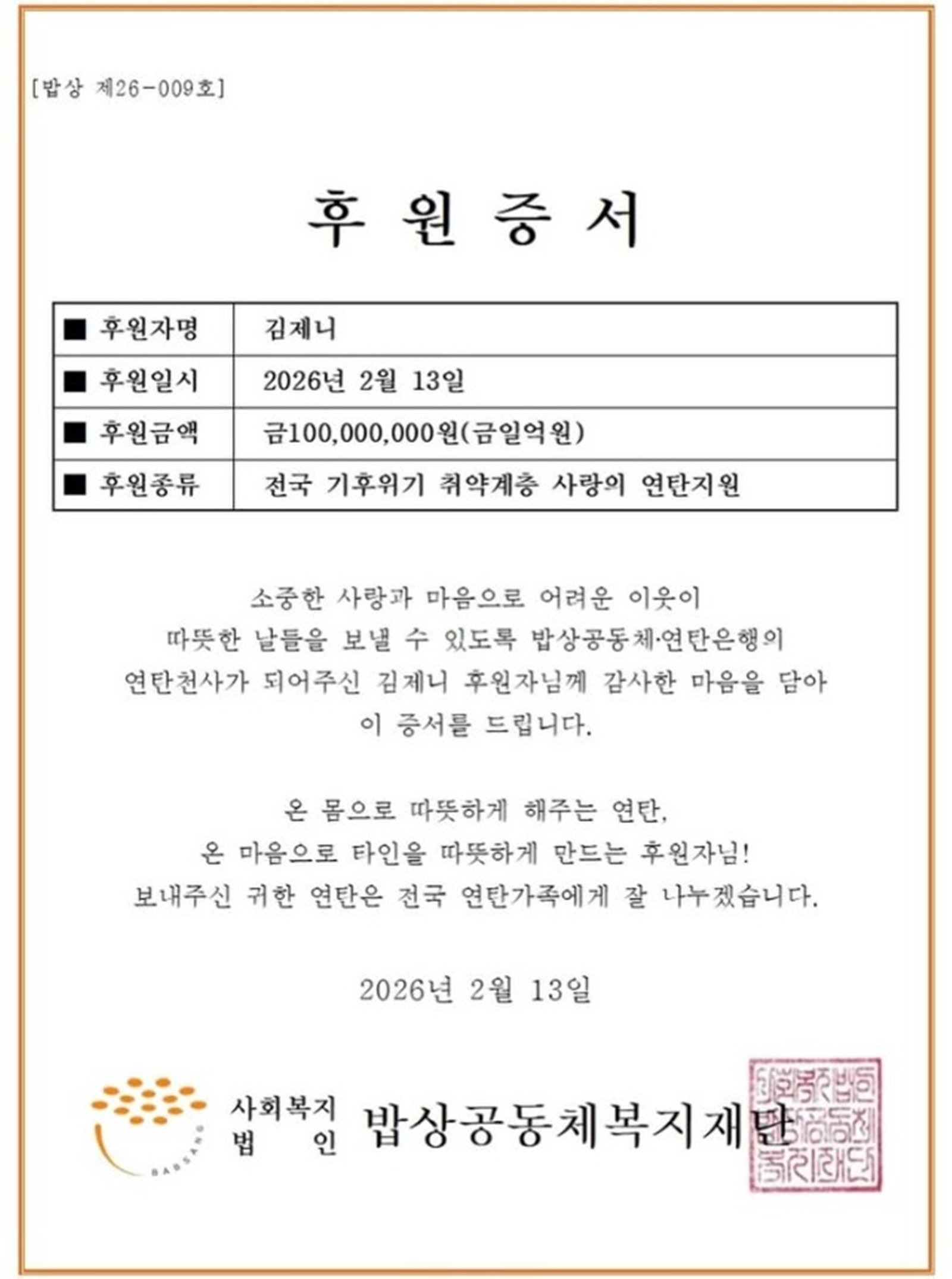 이어 션은 후원 증서를 공개해 눈길을 모았다. 후원 증서에는 제니의 본명 김제니로 1억 원이 기부된 내용이 담겼다.