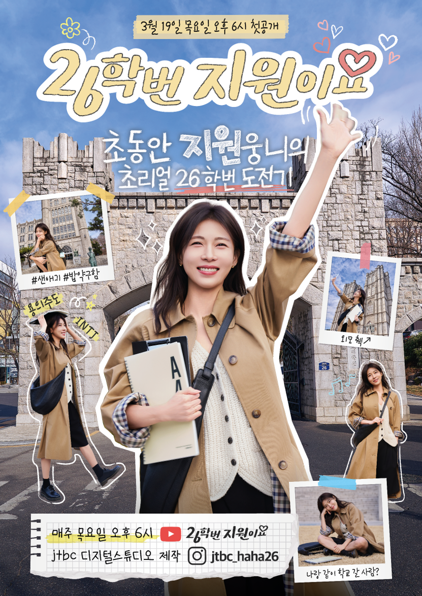 배우 하지원의 26학번 신입생 도전기, JTBC 디지털스튜디오 ‘26학번 지원이요’는 19일 저녁 6시 동명의 유튜브 채널에서 공개될 예정이다.