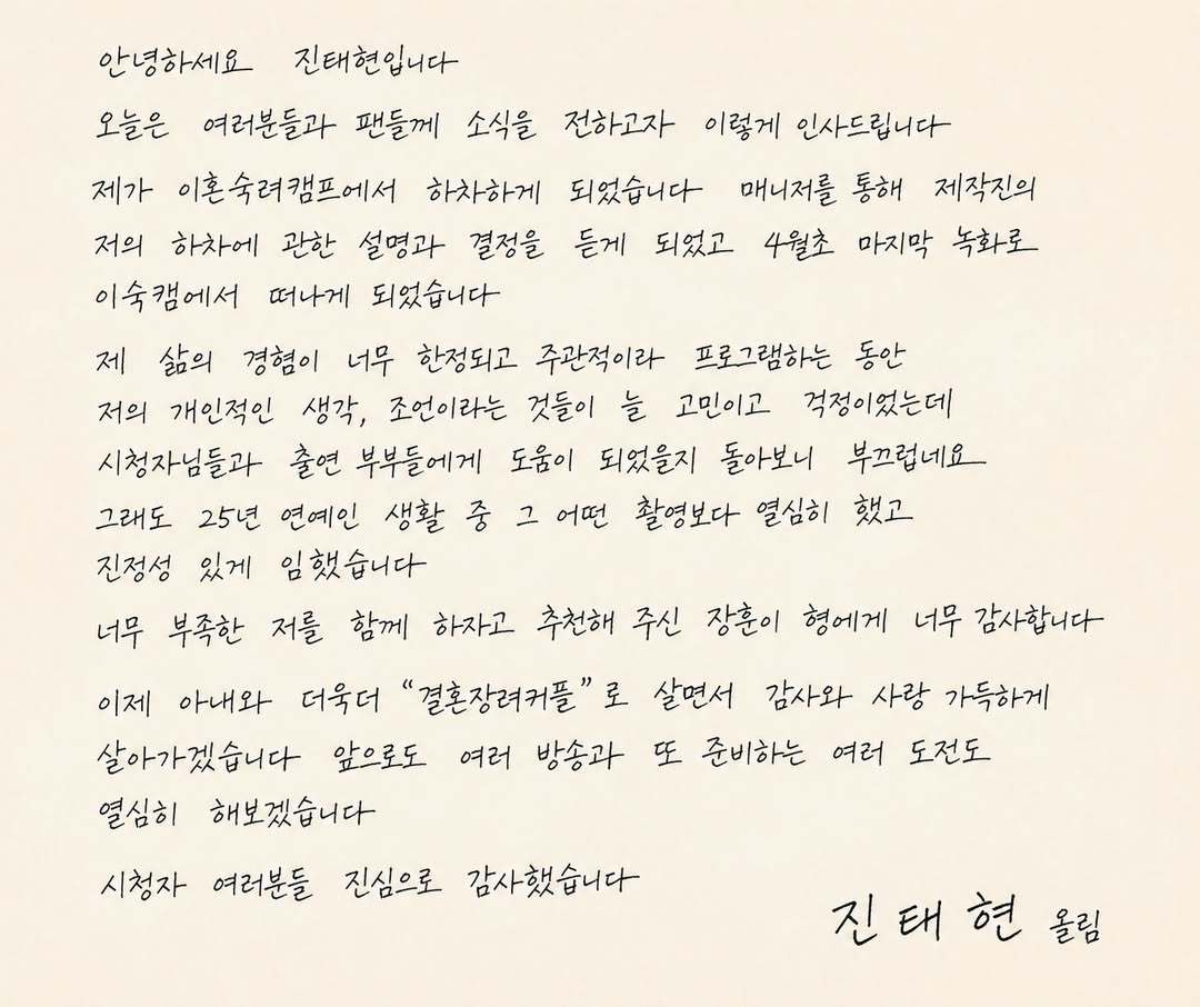이어 진태현은 자필 편지를 통해 “제가 ‘이혼숙려캠프’에서 하차하게 되었습니다. 매니저를 통해 (제작진이 결정한) 제 하차에 관한 설명과 결정을 듣게 되었고, 4월 초 마지막 녹화로 ‘이혼숙려캠프’에서 떠나게 되었습니다”라며 “제 삶의 경험이 너무 한정되고 주관적이라 프로그램 하는 동안 저의 개인적인 생각, 조언이라는 것들이 늘 고민이고 걱정이었는데 시청자님들과 출연 부부들에게 도움이 되었을지 돌아보니 부끄럽네요. 그래도 25년 연예인 생활 중 그 어떤 촬영보다 열심히 했고 진정성 있게 임했습니다”라고 이야기했다.