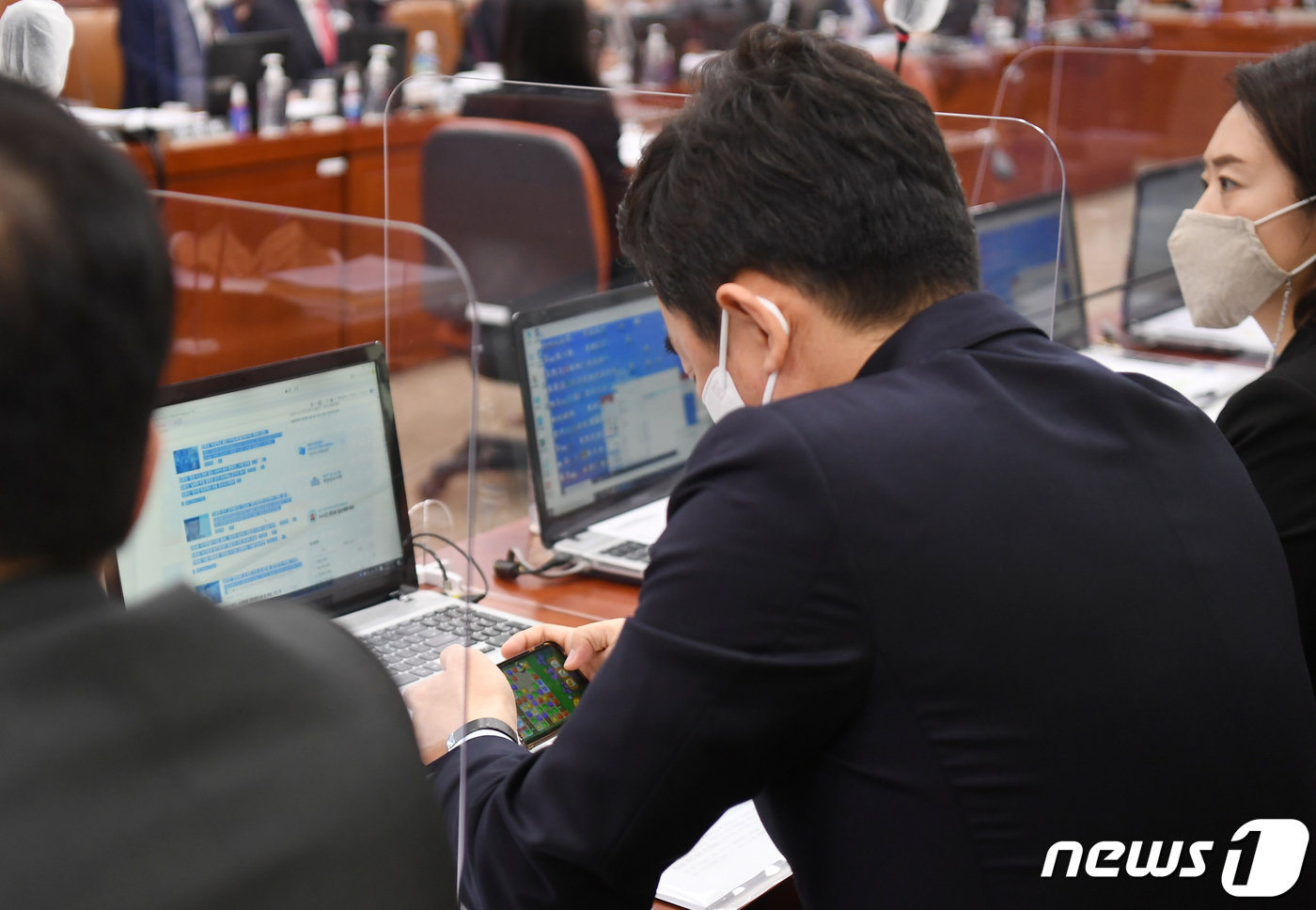 강훈식 더불어민주당 의원이 22일 서울 여의도 국회에서 열린 산업통상자원중소벤처기업위원회의 산업통상자원부에 대한 종합감사에서 국감 도중 자신의 휴대전화로 모바일 게임을 하고 있다. (출처=뉴스1)