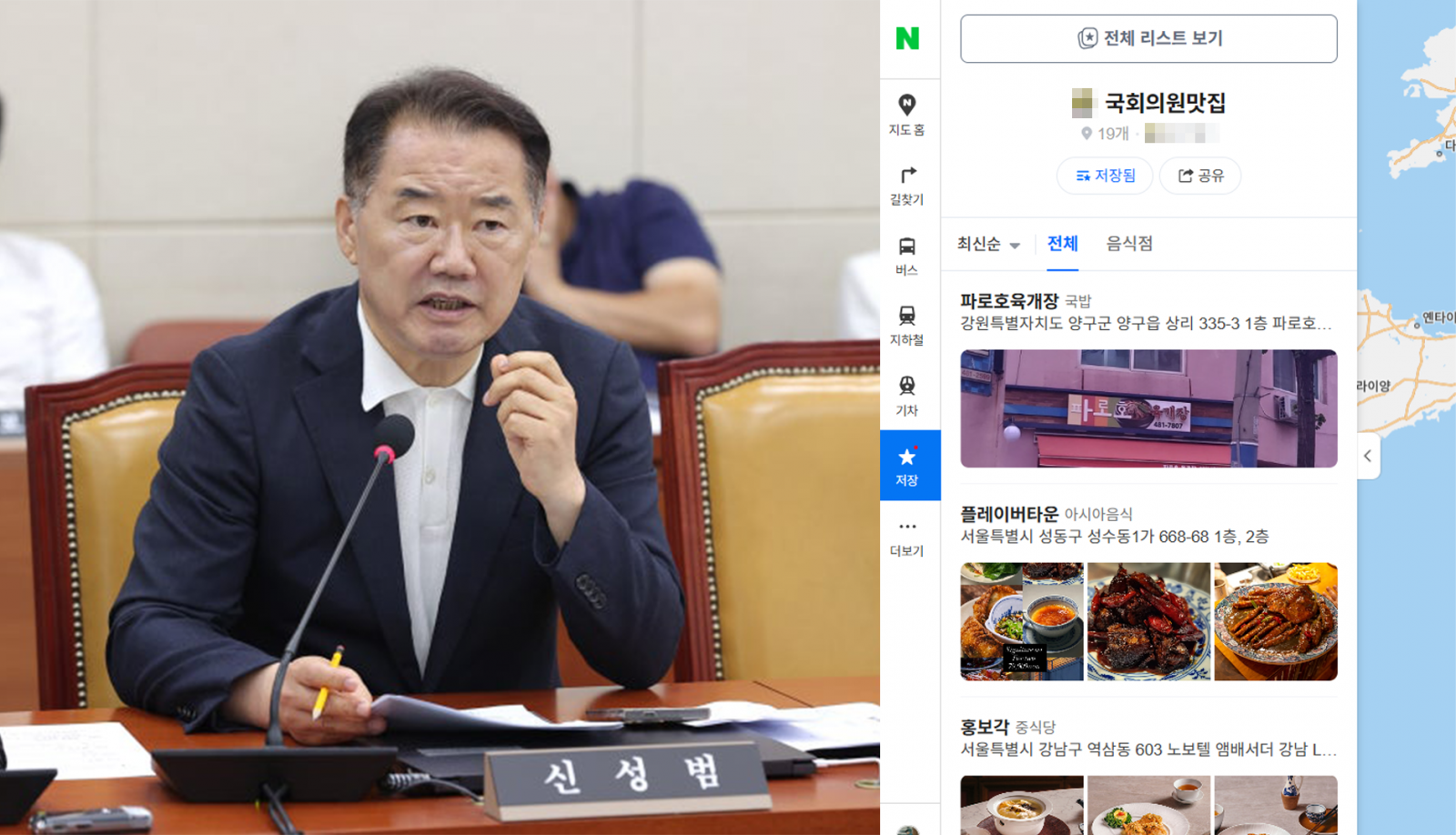 네이버 지도를 통해 쉽게 찾아볼 수 있는 ‘국회의원 맛집 리스트’. 지난 2024년 국민의힘 신성범 의원(왼쪽)이 국정감사 도중 작성한 맛집 리스트(오른쪽)가 알려지며 누리꾼들 사이에서 화제가 되고 있다. (출처=뉴시스, 네이버 지도 캡처)