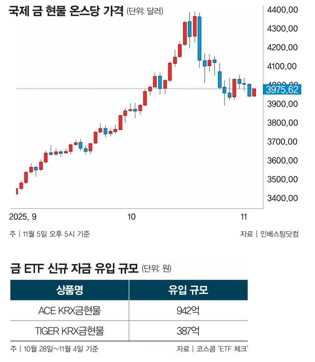 한때 온스당(1온스=약 28g) 4400달러(약 636만4000원)를 눈앞에 뒀던 국제 금 현물 가격이 최근 3900달러대에서 횡보하고 있다(그래프 참조). 안전자산에 대한 수요가 꺾이면서 10%대 하락률을 기록한 것이다. 이른바 ‘김치 프리미엄’이 붙었던 국내 금 현물 가격은 10월 15일(종가 기준) 온스당 22만7000원에서 11월 5일 18만9770원으로 16% 넘게 내렸다.