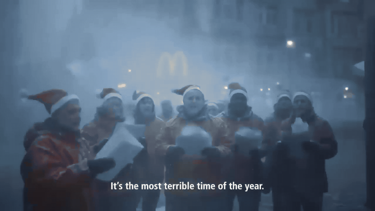 광고는 크리스마스 시즌에 벌어질 만한 여러 혼란스러운 상황을 AI 이미지로 묘사했다. 성가대가 눈보라를 맞은 채 노래를 부르고, 할인 행사장에서 고객 둘이 같은 곰 인형을 두고 실랑이를 벌이며, 산타클로스가 도로 정체에 갇혀 분노하는 장면 등이 이어진다. 마지막은 “연말의 혼란을 피해 내년 1월까지는 맥도날드로 피신하라”는 문구로 마무리된다.