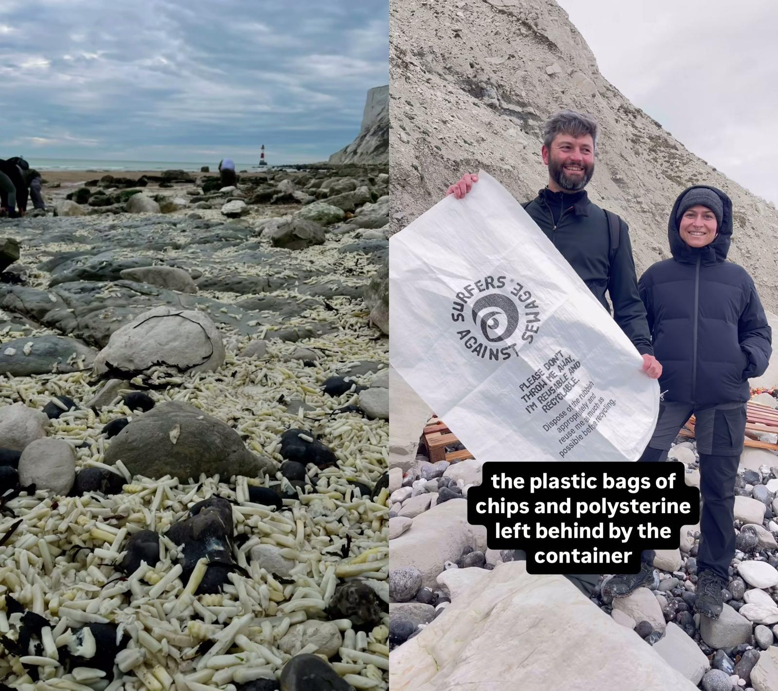 감자튀김으로 뒤덮힌 해변(왼쪽)과 해변 정화 작업에 나선 자원봉사자들(오른쪽). 페이스북 @plasticfreeeastbourne