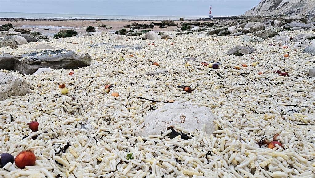 감자튀김으로 뒤덮인 英 해변…“화물선 실수에 생태계 파괴 우려”