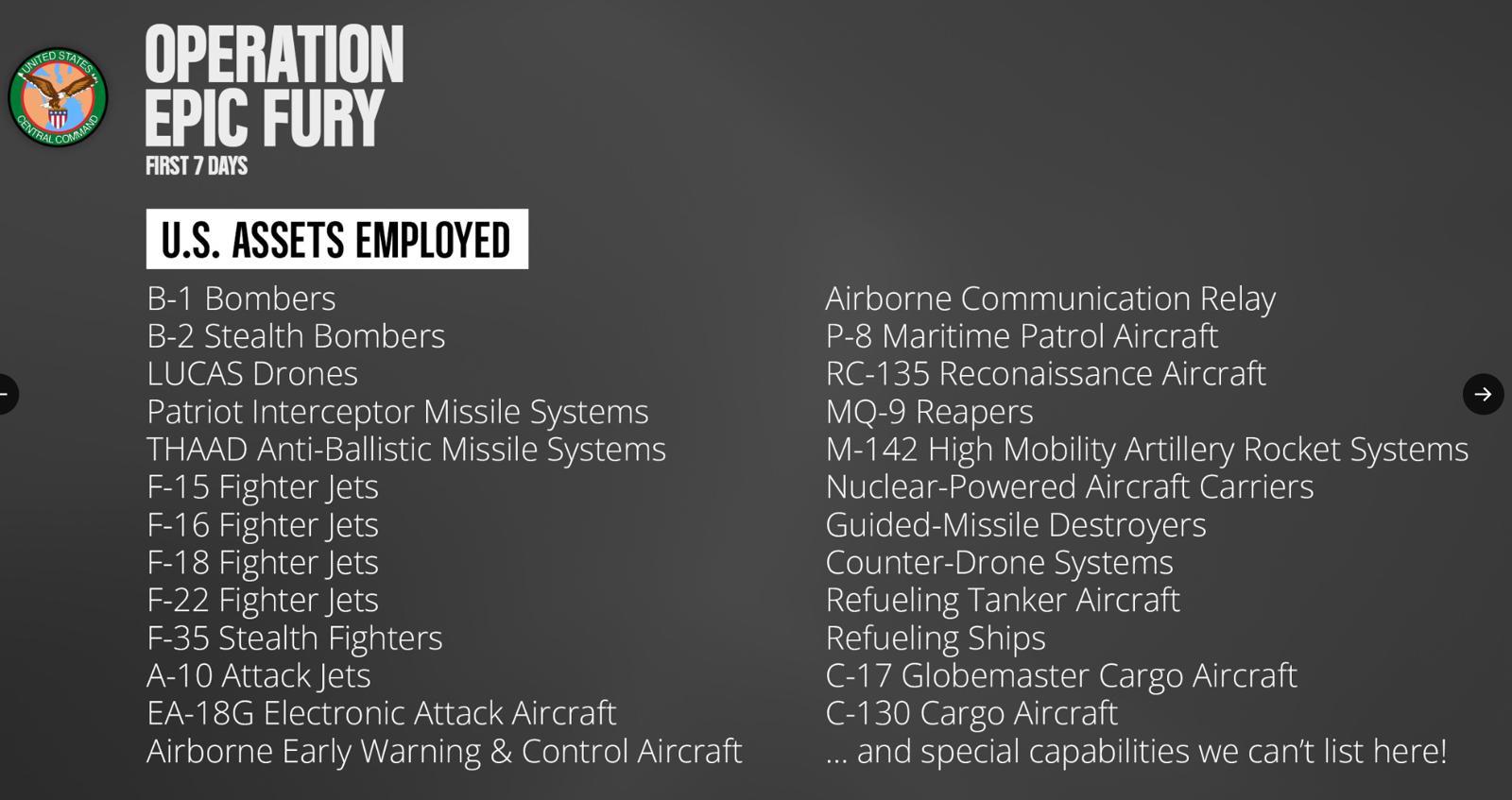 미군 중부사령부(CENTCOM)는 이날 X(엑스·옛 트위터)에 이같은 내용이 포함된 중간 작전 성과를 발표했다. 이에 따르면 ‘장대한 분노(Epic Fury)’ 작전 개시 이후 일주일 동안 3000곳 이상의 목표물을 타격했고, 이란 선박 43척이 파손되거나 파괴됐다. 이란 정권의 안보군사 체계를 해체하기 위해 목표물을 공격하고 있다는 설명이다. 특히 “미국에 즉각적인 위협이 되는 거점을 우선적으로 타격했다”고 말했다.