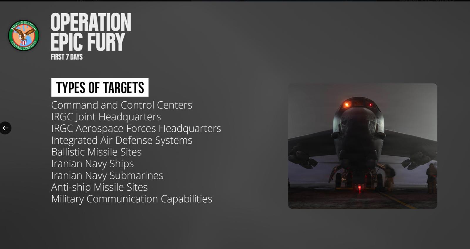 구체적으로 이란의 군 지휘·통제 센터와 이란 이슬람혁명수비대(IRGC) 합동본부, IRGC 항공우주군 본부, 통합 방공망, 탄도미사일 기지, 해군 함정, 해군 잠수함, 군 통신 시설 등이 주요 타격 대상이었다고 밝혔다.