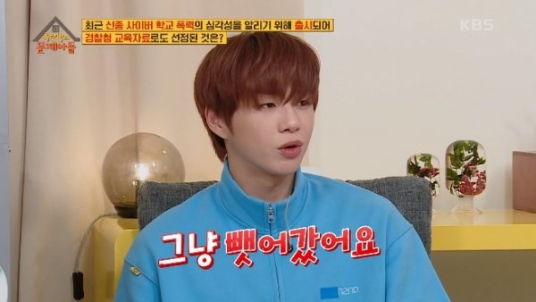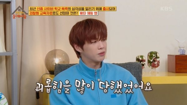 자신의 일화도 공개했다. 강다니엘은 “초등학교 때 전학을 자주 했는데 괴롭힘을 많이 받았다. 이유 없이 욕을 했다. 생긴 게 마음에 안 들었나보다”고 이야기했다.