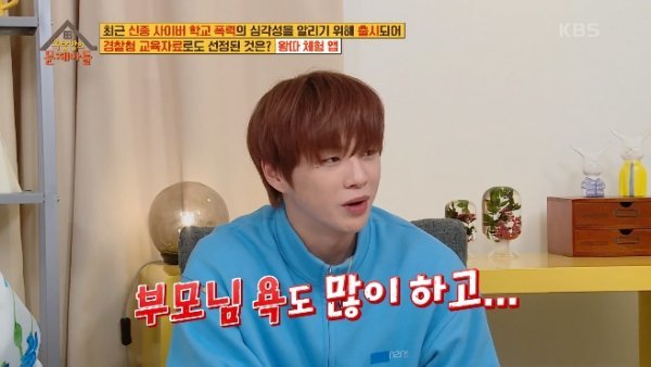 방송에서는 실제 왕따 체험 앱의 화면이 공개되기도 했다. 가상의 가해자는 피해자에게 조롱하거나 괴롭힘을 당하는 사진을 단체 대화방에 공유하며 정신적 압박을 가했다. 강다니엘은 “저건 앱이라 착한 편이다. 진짜 순화된 거다. 요즘뿐 아니라 나 때도 청소년들이 욕을 진짜 잘 한다. (앱 화면에는 없지만) 부모님 욕도 많이 한다”며 “친한 동생이 있는데 걔가 예전에 괴롭힘 당한 이야길 들어보니 수법이 똑똑하다. 여러 명이서 괴롭히는 설명할 방법이 없다. 가해자 학부모도 뭐가 문젠지 모르다. ‘친구끼리 싸울 수도 있다’는 생각이다”라며 답답함을 호소했다.