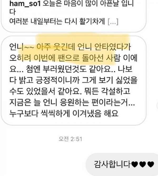 함소원은 9일 자신의 인스타그램에 한 누리꾼에게 받은 메시지 내용을 공개했다. 한 누리꾼은 “안티였다가 이번에 팬으로 돌아선 사람이에요. 처음엔 부러웠던 것도 같아요. 나보다 밝고 긍정적이니까 보기 싫었을 수 있었을 거 같아요. 지금은 응원하는 편이라는 거. 누구보다 씩씩하게 이겨냈음 해요”라고 응원했다.