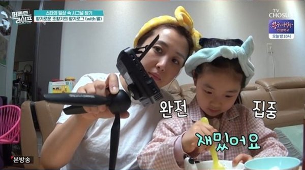 조향기는 붕어빵 외모를 자랑하는 8살 딸 하임이와 천연팩 만들기로 하루를 시작했다. 그는 “촬영이 있는 날 피부 컨디션이 안 좋으면 천연팩을 한다. 딸과 놀아주면서 ‘1타 2피’로 가끔 팩을 만든다”고 설명했다.