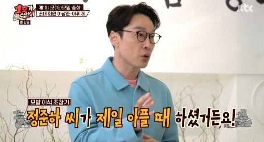 이어 "4년 전 비절개로 모발 이식을 했다"면서 정준하의 모발 이식을 털어놔 스튜디오에 출연한 정준하를 당황하게 만들었다. 이에 정준하는 "2004년도에 모발 이식을 했다. 비절개, 절개 다 했다. 그때 당시 3000모 했다"고 했고 박준형은 바로 회원가입 계약서를 건네 재미를 더했다.