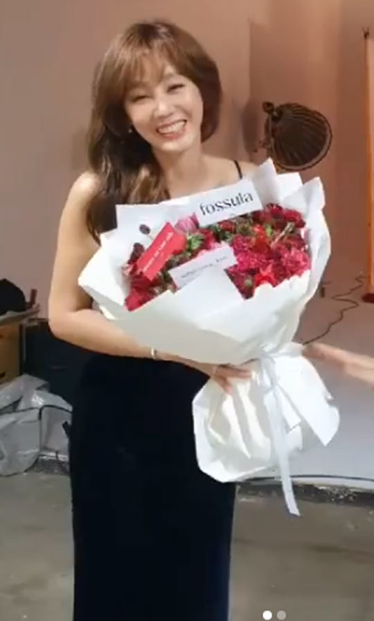 사진 속 김성령은 촬영장에서 꽃을 선물 받고 환하게 웃으며 행복한 마음을 드러냈다. 특히 김성령은 그동안 고수해왔던 쇼트커트가 아니라 컬이 들어간 롱 헤어로 눈길을 사로잡았다. 시크한 매력을 벗고 청순함까지 소화한 것.