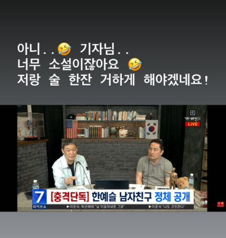 이에 한예슬은 ‘가세연’의 영상을 캡처해 인스타그램에 올리며 “아니 기자님, 너무 소설이지 않냐. 나랑 술 한 잔 거하게 해야겠다”며 “왜 이런 일들은 항상 소속사와 계약이 만료됐을 때 일어나는 건지 참 신기하다”고 의혹을 강력 부인했다.