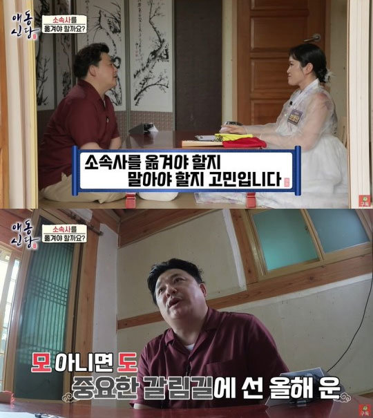 9일 유튜브 채널 베짱이엔터테인먼트 콘텐츠 \'애동신당\'에는 윤정수가 의뢰인으로 출연했다. 먼저 윤정수는 사업에 대한 고민을 보월당에 털어놨다. “10년 인연인 소속사와 관계는 좋지만, 이 상황에서 계속 같이 가는 게 맞을지 새 출발을 하는 게 나을지 모르겠다. 마음이 반반이다”라고 말했다.