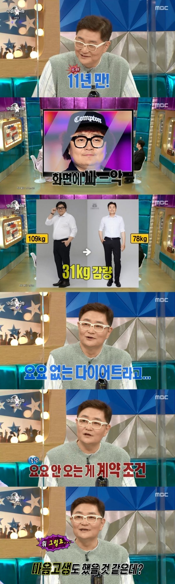 이날 정재용은 “11년 만에 ‘라디오스타’에 출연한다. 대외적으로 활동을 잘 안 하는 편이다. 그리고 체중이 많이 쪘었다. 화면이 꽉 찬다고 하더라. 그런 말을 들으니 기피증이 생기더라. 그 후부터 방송 출연을 잘 하지 않게 됐고, 그렇게 쉬다 보니 10년이 지나 11년이 지나버렸다”고 말했다.