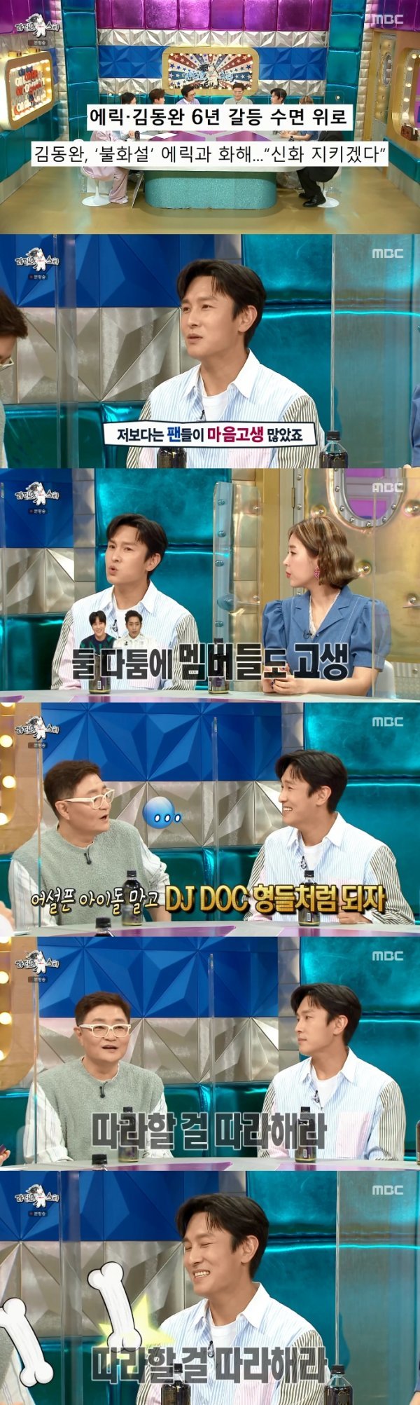 덩달아 이날 신화 불화설도 언급됐다. 김동완은 “우리는 늘 비슷했다. 늘 싸우고 풀었다. 그런데 이번에 많이 대중에게 드러났다. 사실 이번에 우리끼리 이야기한 게 있다. ‘어설프게 아이돌이 되려 하지 말고 DJ DOC 형들처럼 되어야 해 이제 된 거야’라고 했었다”고 말했다. 그러자 정재용은 “그래서 싸운 거냐. 따라 할 걸 따라 하라”고 말해 웃음을 자아냈다.