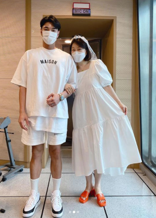 쇼핑호스트 이민웅은 28일 자신의 인스타그램에 “오늘 어쩜 이렇게 맞춰 입고 와갖고(웃음) 집안이 반대하는 결혼식 했어요. 뽁뽁이 면사포에 노래방책에 손 올리구 #최화정의파워타임 #좋아유”라는 글과 함께 사진을 공개했다.