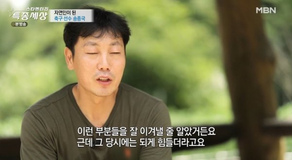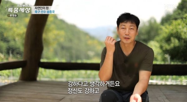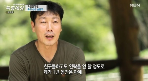 송종국은 이혼 이후 돌연 잠적해 화제가 됐다. 그는 “산에 들어온지 7년 정도 됐다. 가장 친한 주위 친구들하고도 연락을 안 했다. 1년 정도는 연락을 안 하고 들어왔다. 개인적으로 강하다고 생각했다. 잘 이겨낼 줄 알았는데 그 당시에는 너무 힘들었다. 빨리 아무도 없는 곳에 가서 사라지자고 생각했다. 다 접고 여기 들어왔다”고 고백했다.