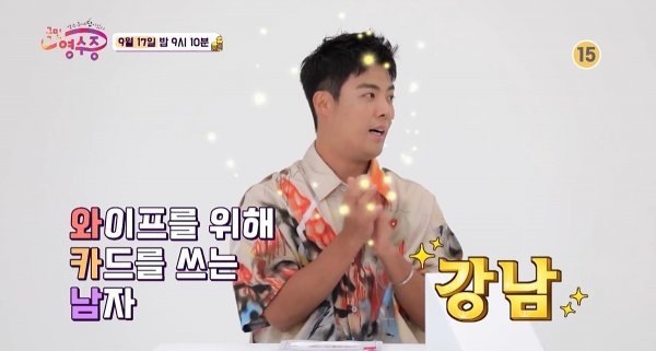 이날 송은이는 "보통 '와카남'은 와이프 카드를 쓰는 남자를 말하지만 이분은 와이프를 위해 카드를 쓰는 남자다"라면서 강남을 소개한다.