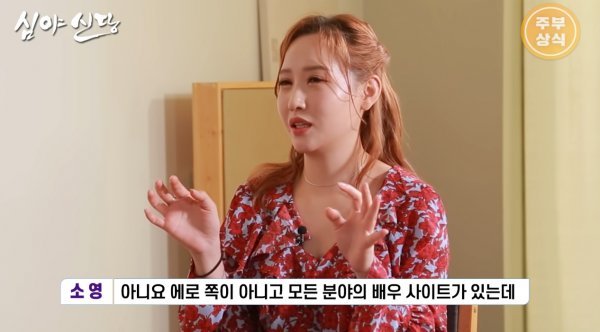 소영은 “MIB19에 소속돼 있는 배우 소영이다. AV(Adult Video, 성인 영화) 배우다”라고 자신을 소개한 뒤, “원래 3사 방송국 재연배우로 활동을 하던 중 배우 사이트에 '19IP'라는 글귀를 봤다. 궁금해서 연락했더니 (성인배우 쪽이라고) 소개를 해줘서 지금 소속사에 들어오게 됐다”고 성인배우가 된 계기를 밝혔다.