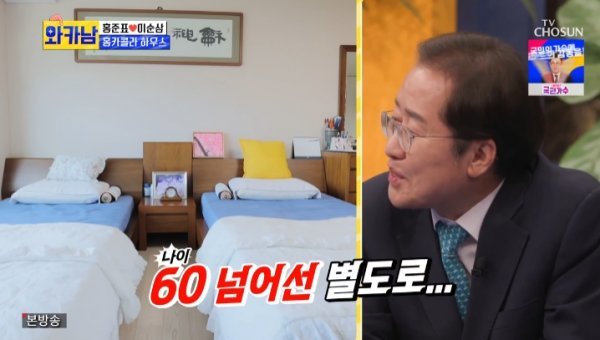 이어 홍준표 의원 집이 공개됐다. 널찍한 거실과 침실 내 침대 2개가 눈길을 끌었다. 홍 의원은 “60살이 넘어서는 침대를 따로 쓴다. 잘 때 뒤척거려서 잠을 못 잔다. 서로 불편하다”면서도 절대 각방은 쓰지 않는다고 말했다.