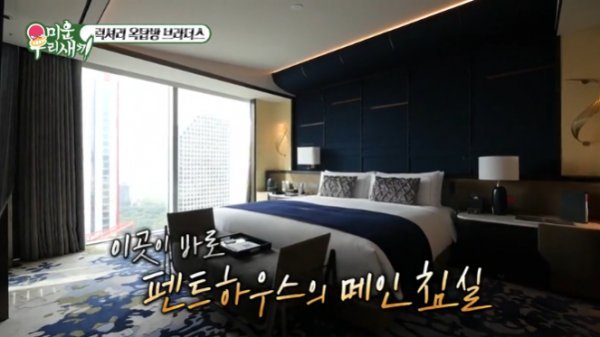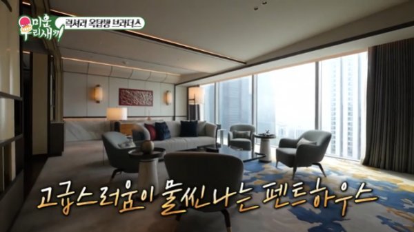 다음 코스는 럭셔리 호텔이었다. 이들이 도착한 곳은 고가의 장식품과 가구로 꾸며진 28층 펜트하우스였다. 이상민은 “이 호텔에서 가장 고가의 룸이다. 하루 숙박료는 2000만 원정도”라며 “각계각층 주요 VIP들이 묵는 곳이다. 드라마 ‘펜트하우스’에서 로건리 집이었다. 그래미어워즈 때 BTS가 이 곳에서 대기했다”고 설명했다.