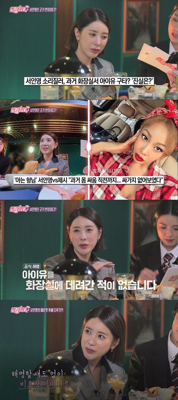 먼저 서인영은 '아이유를 화장실로 데려가서 구타했다'라는 루머에 대해 "때리고 싶으면 대기실에서 때리지 왜 화장실로 끌고 가겠는가? 아이유 씨를 화장실에 데려간 적도, 구타한 적도 없다. 아이유 씨가 '그런 일이 없다'라고 해명을 해주신 적도 있다"라며 거짓임을 밝혔다.
