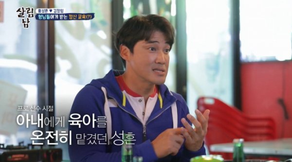 홍성흔은 “아내가 육아를 다 알아서 하는 것을 원칙으로 세워두고 18년 동안 프로 생활을 했다. 은퇴 이후에도 그게 몸에 배어서 너무 괴롭다”며 “솔직히 시합 끝나고 집에 들어 있을 때 애들이 다 잠들어 있으면 좋겠다는 생각을 많이 했다. 새벽에 아이들이 울면 화리 엄마가 놀이터로 끌고 나갔다. 당연하다고 생각하고 있었으니 되게 이기적이었다”고 스스로를 돌아봤다. 이세준은 “계속 그렇게 살 순 없다. 그렇게 해 온 화리 엄마가 희생인 것이고 네가 잠깐 아이들 등하교 맡는다고 희생이 아니다”고 일침을 가했다.